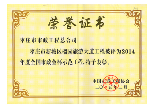 “棗莊市新城區榴園旅游大道工程”被評為2014年度全國市政金杯示范工程