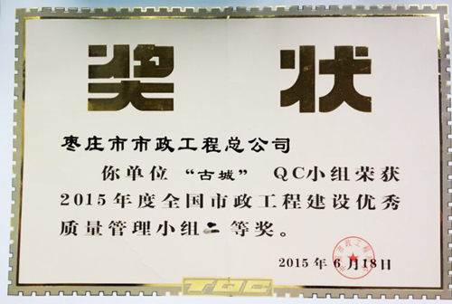 “古城”QC小組榮獲2015年度全國市政工程建設優秀質量管理小組二等獎