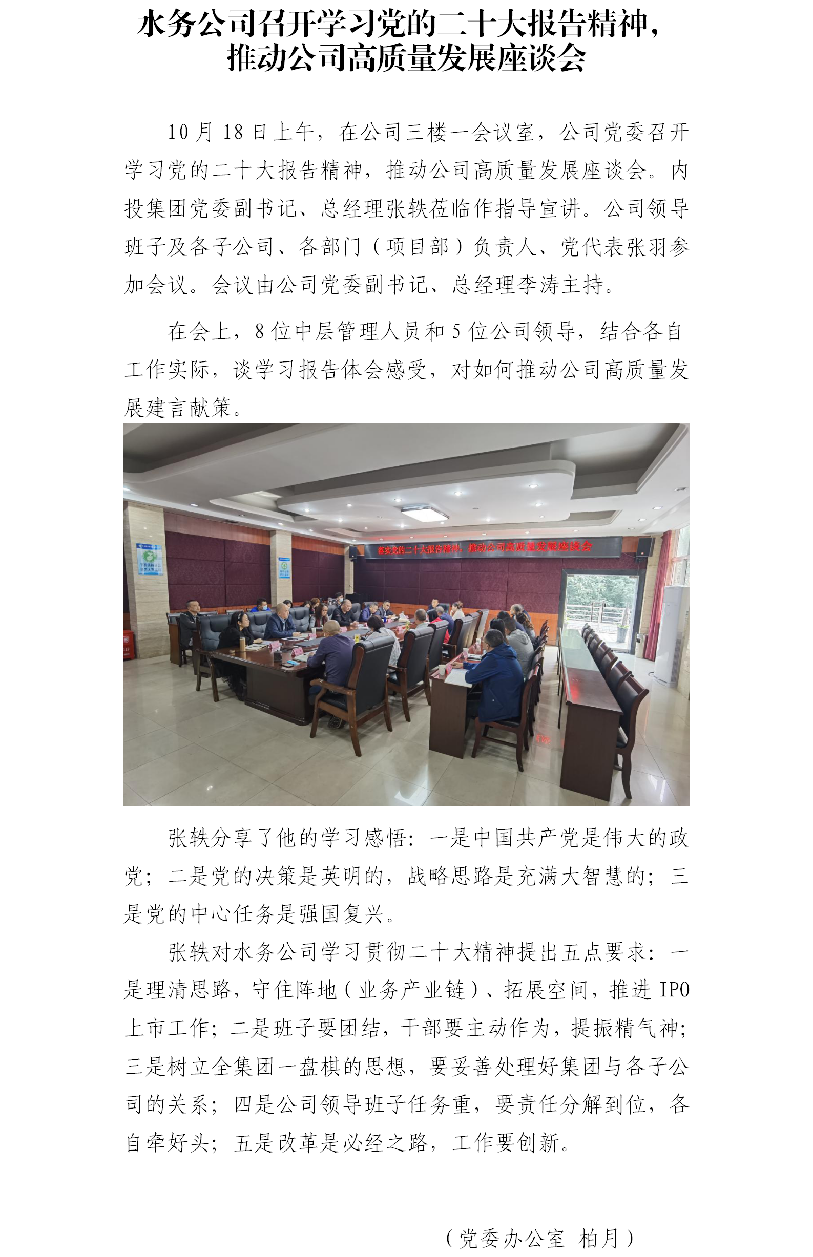 水務(wù)公司召開(kāi)學(xué)習(xí)黨的二十大報(bào)告精神, 推動(dòng)公司高質(zhì)量發(fā)展座談會(huì)
