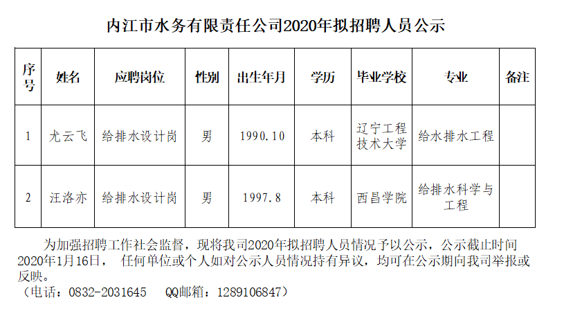 內(nèi)江市水務(wù)有限責任公司2020年擬招聘人員公示