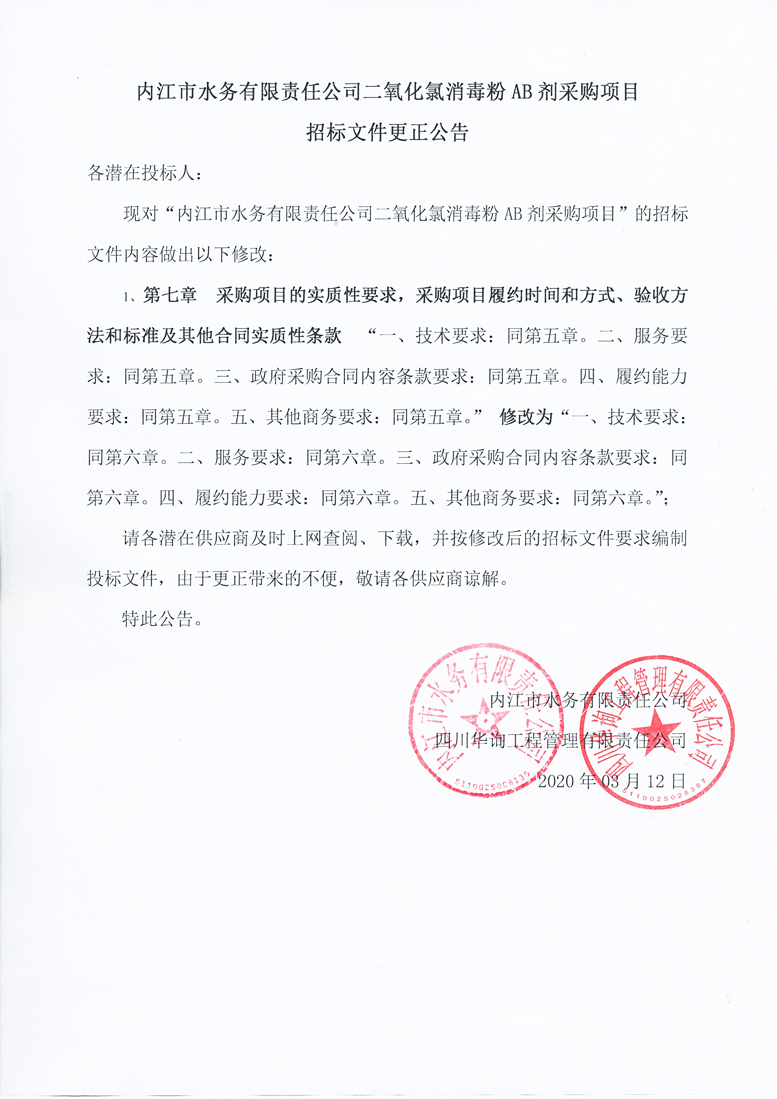 內(nèi)江市水務(wù)有限責(zé)任公司二氧化氯消毒粉AB劑采購(gòu)項(xiàng)目招標(biāo)文件更正公告