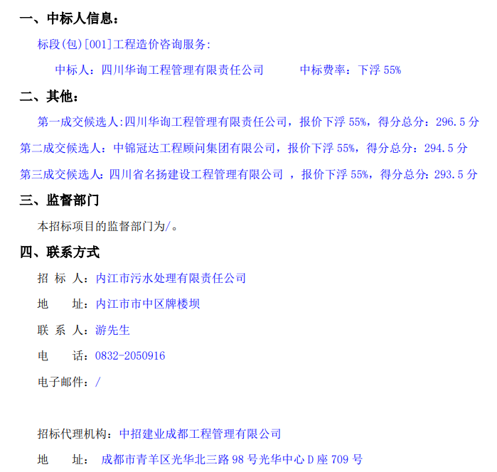 內(nèi)江市第二污水處理廠二期工程造價咨詢服務(wù)項目中標(biāo)結(jié)果公示