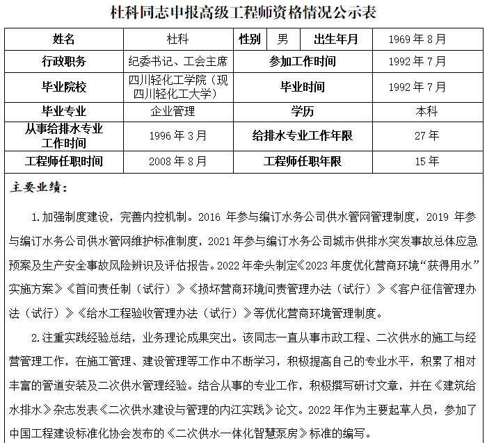附件:杜科同志申報(bào)高級(jí)工程師資格情況公示表