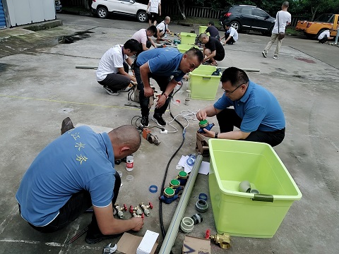 720日下午,二水廠維修車間門前,來自市水務(wù)公司管網(wǎng)運行部、鄉(xiāng)鎮(zhèn)供水部的11支隊伍22名技能好手,正在緊張進(jìn)行著搶維修實操比賽:有的正認(rèn)真識別設(shè)計圖;有的正在切割水管,熔合管道;有的已經(jīng)開始組裝管道、閥門......一個個全神貫注,顧不上汗水模糊了眼睛,浸濕了衣裳。這是公司開展搶維修技能競賽上實際操作環(huán)節(jié)的一個場景。