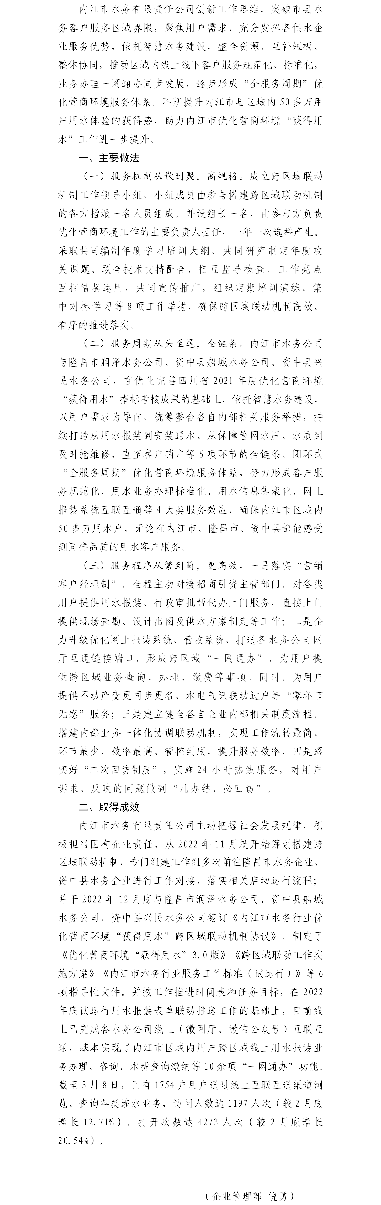內(nèi)江市啟動水務(wù)行業(yè)優(yōu)化營商環(huán)境“獲得用水”跨區(qū)域聯(lián)動機制