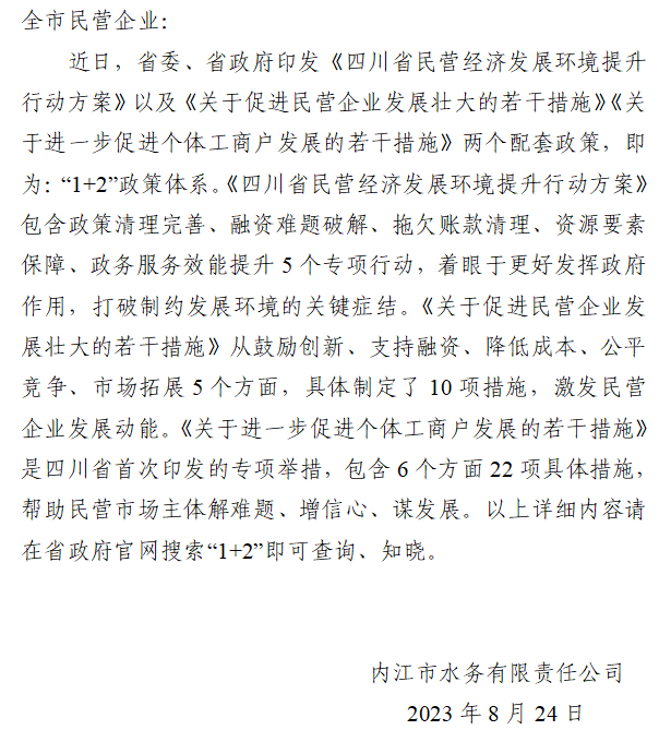 內(nèi)江市“四川省民營經(jīng)濟‘1+2’政策”告知書