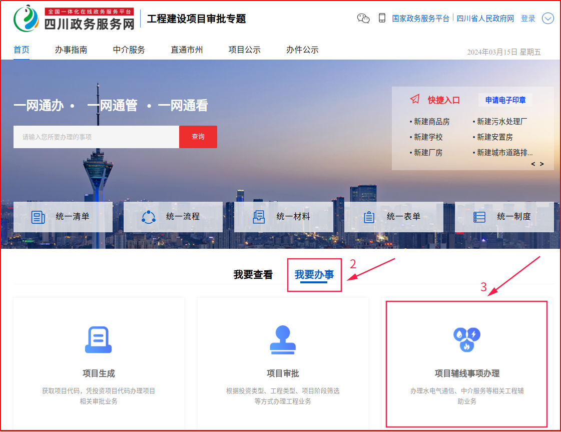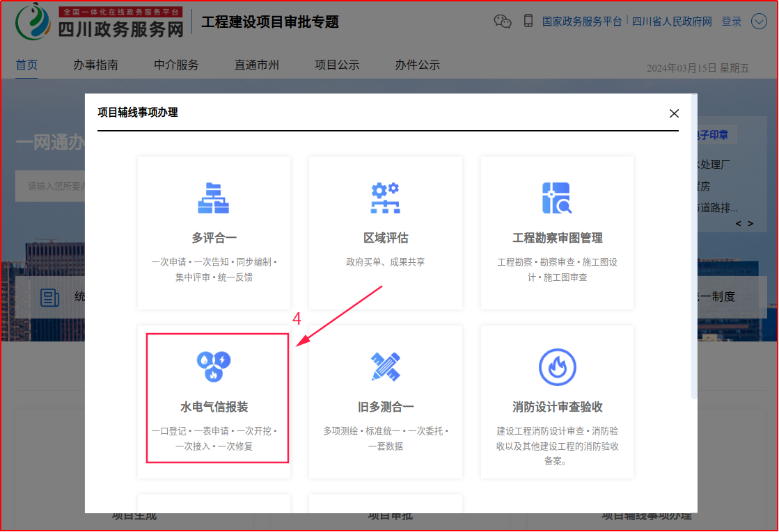 (一)網(wǎng)上申請(qǐng):申請(qǐng)人登錄四川政務(wù)服務(wù)網(wǎng)平臺(tái),點(diǎn)擊工程建設(shè)項(xiàng)目審批專欄,選擇具體報(bào)裝辦理事項(xiàng),提交申請(qǐng),上傳申請(qǐng)材料。